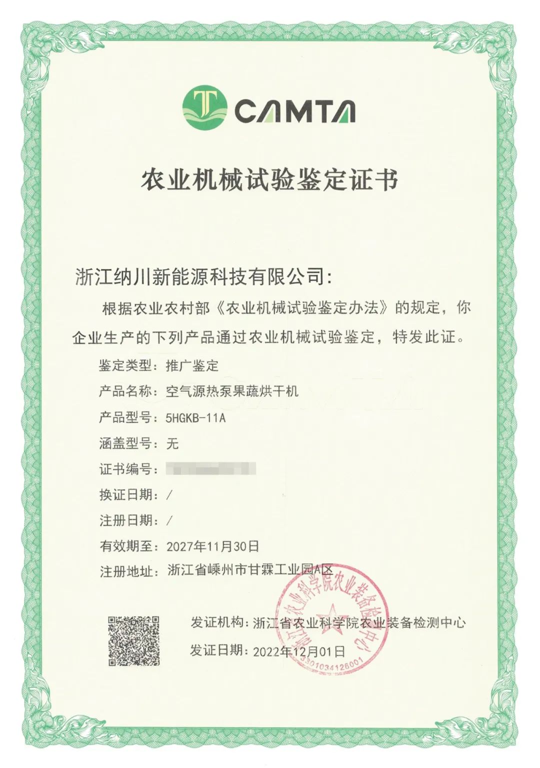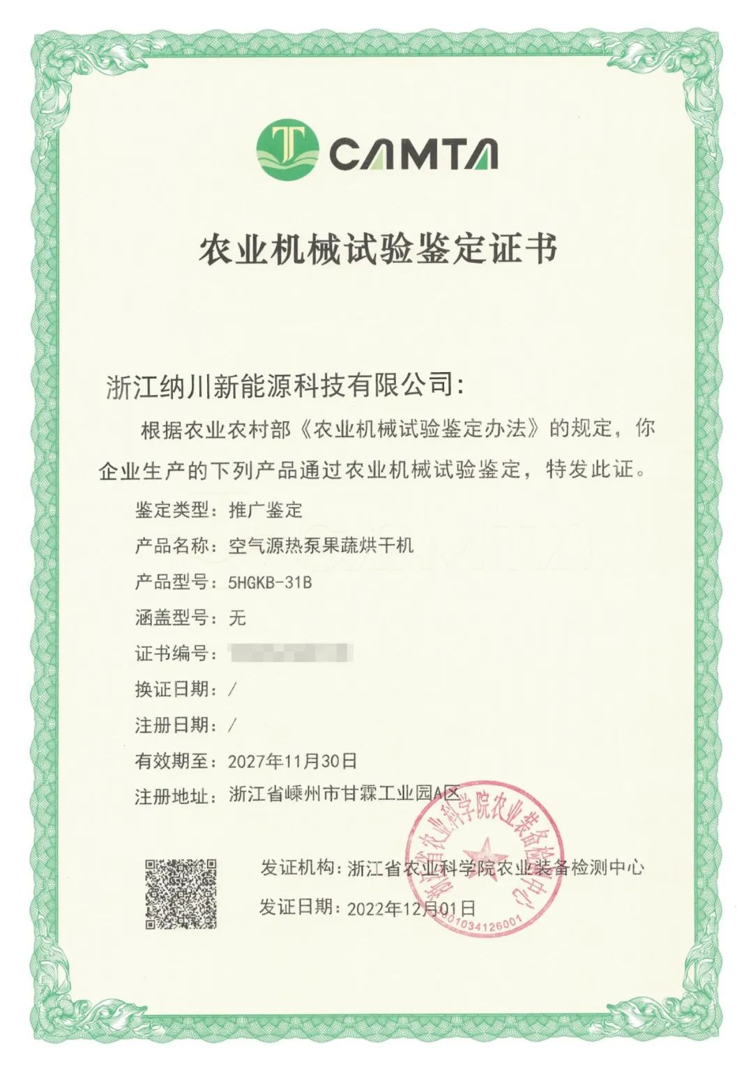 日前,浙江納川新能源三款空氣源熱泵果蔬烘干機——5HGKB-31B、5HGKB-1.3A、5HGKB-11A通過農業農村部《農業機械試驗鑒定辦法》農機技術認定標準審核,獲得了其頒發的“農業機械試驗鑒定證書”,標志著浙江納川新能源在助力中國農業機械化進程和建設新農村的征程中又邁出了堅實的一步。